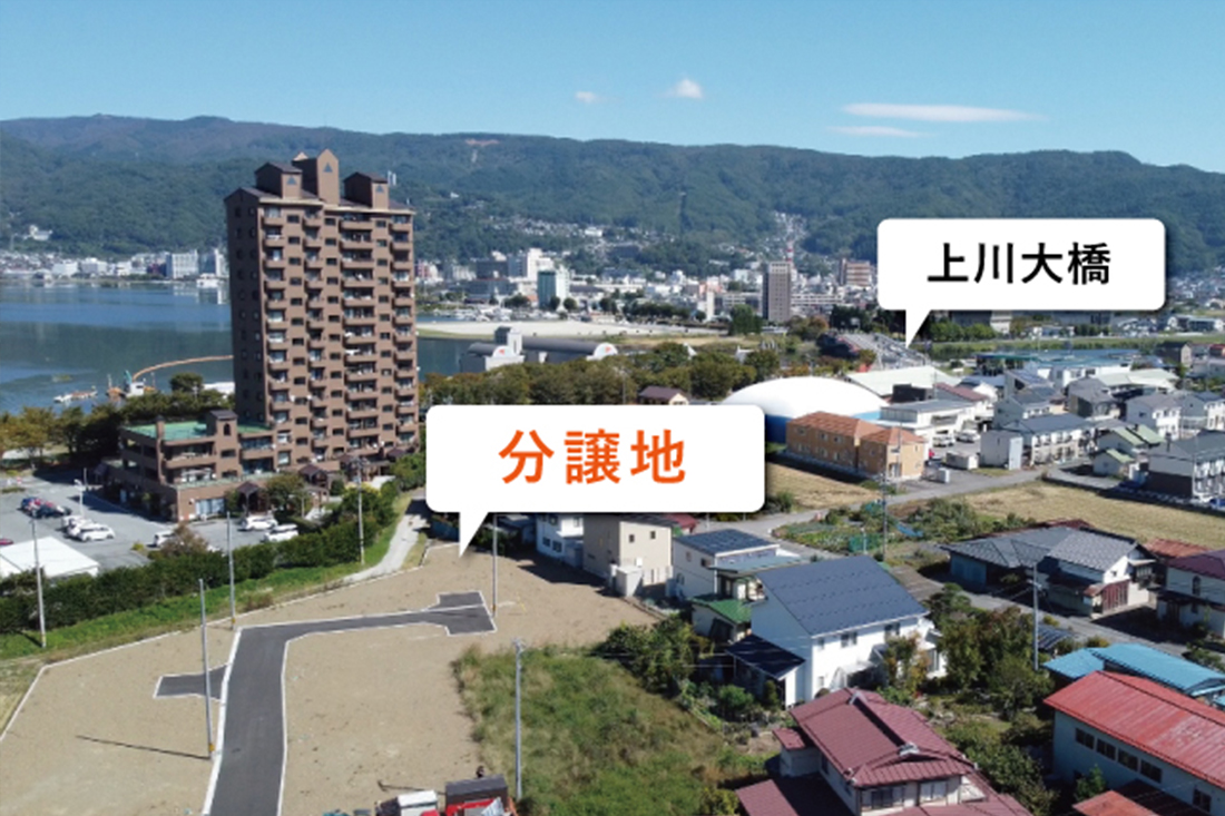 ご紹介する分譲地「cocoru SUWA」は、諏訪湖の南西にある諏訪市渋崎という地域にあります。「上川大橋」の交差点から少し西へ進んだ住宅地に位置し、諏訪湖畔へ徒歩3分という近さが特徴。市役所やスーパーが集まる諏訪市の中心地へは車で約5分のほか、近隣自治体へもアクセスしやすい立地です。