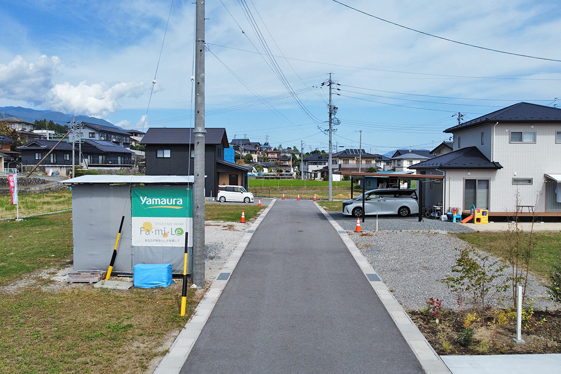 幅員5メートルの開発道路が中央に通る区割り。ライフスタイルに合わせた3棟の住宅がすでに建築されている。