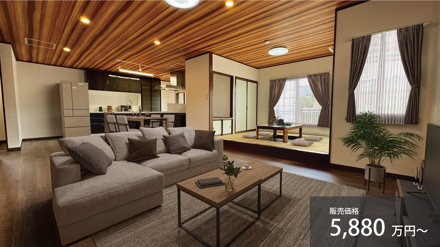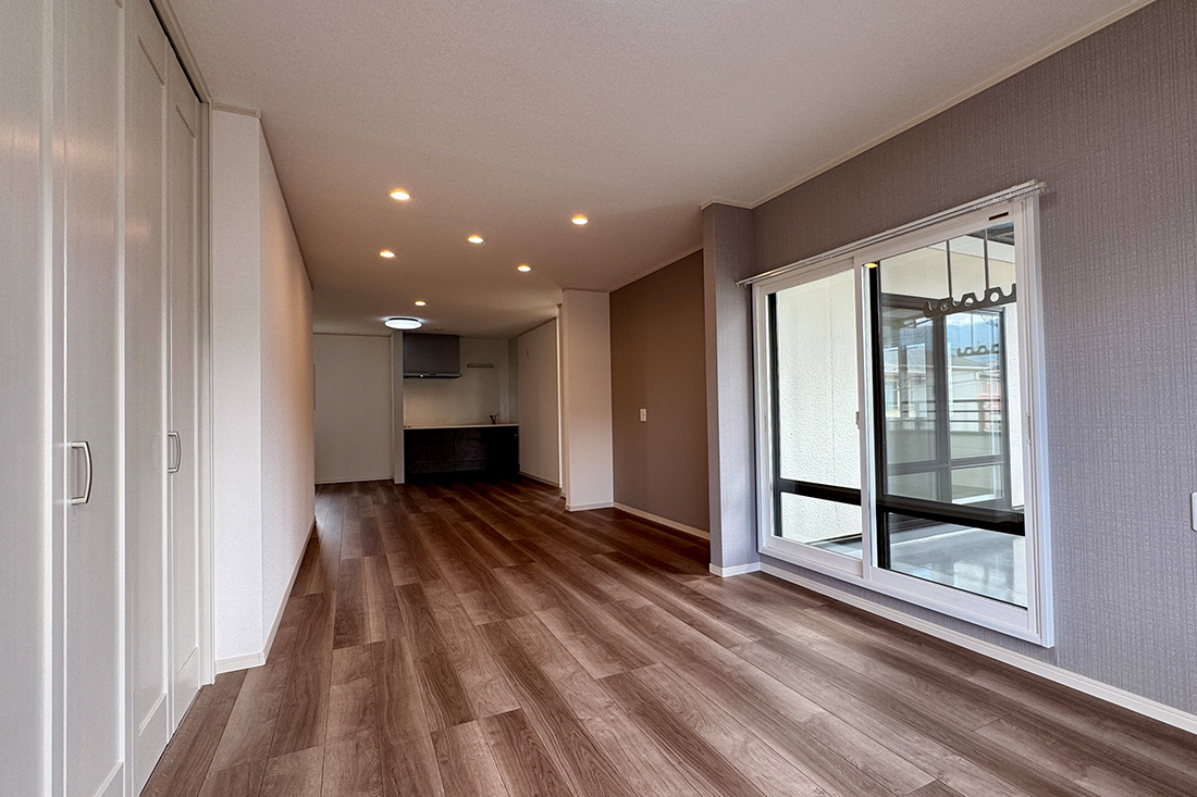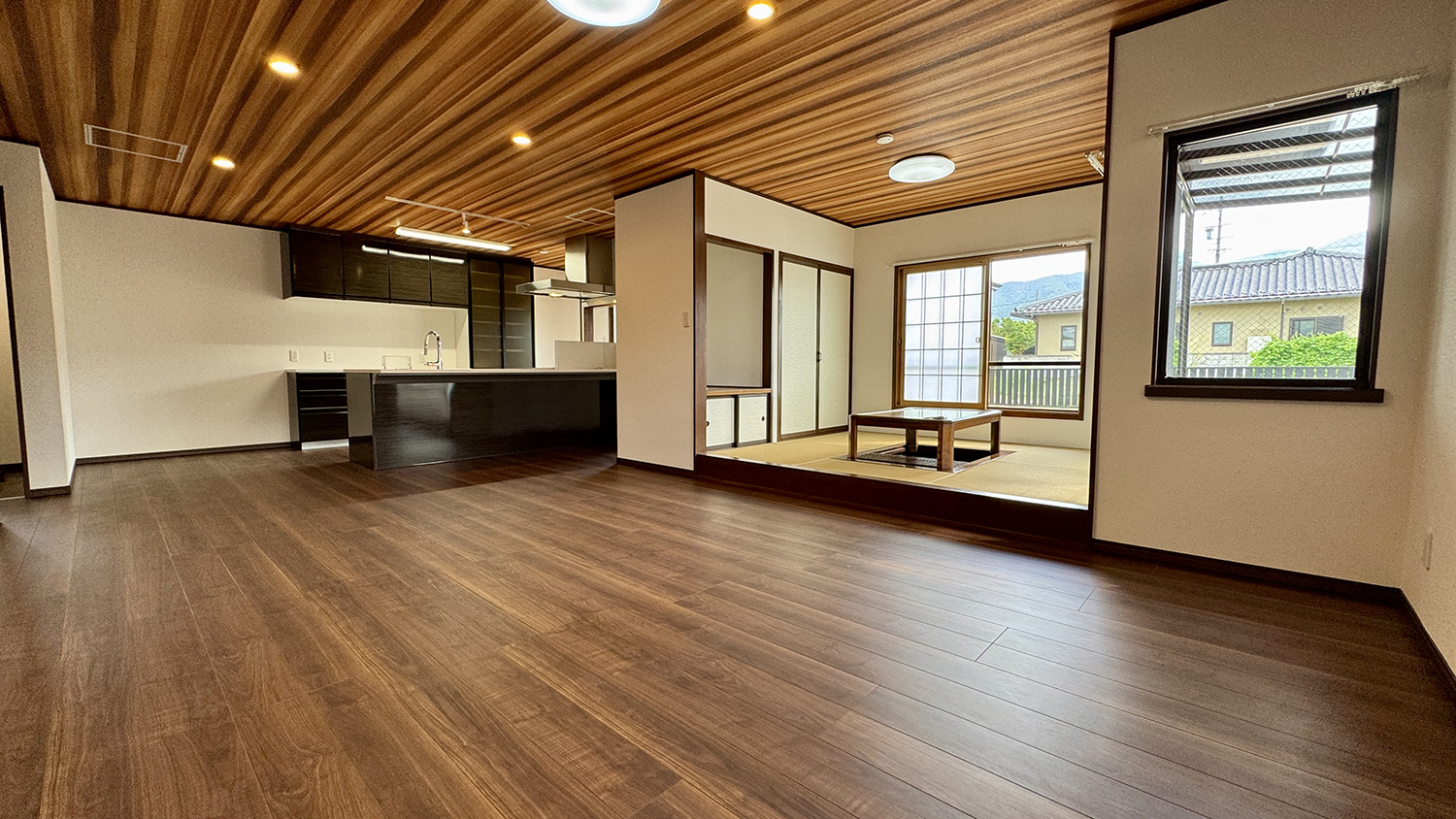 はい、明るく広々とした36帖の大空間ですね。大きな窓から陽ざしが差し込み、家族が自然と集まる心地良いスペースとなっています。床にはダークブラウンのフローリングを採用し、天井のダウンライトや温かみのある間接照明が柔らかい雰囲気を作り出しています。