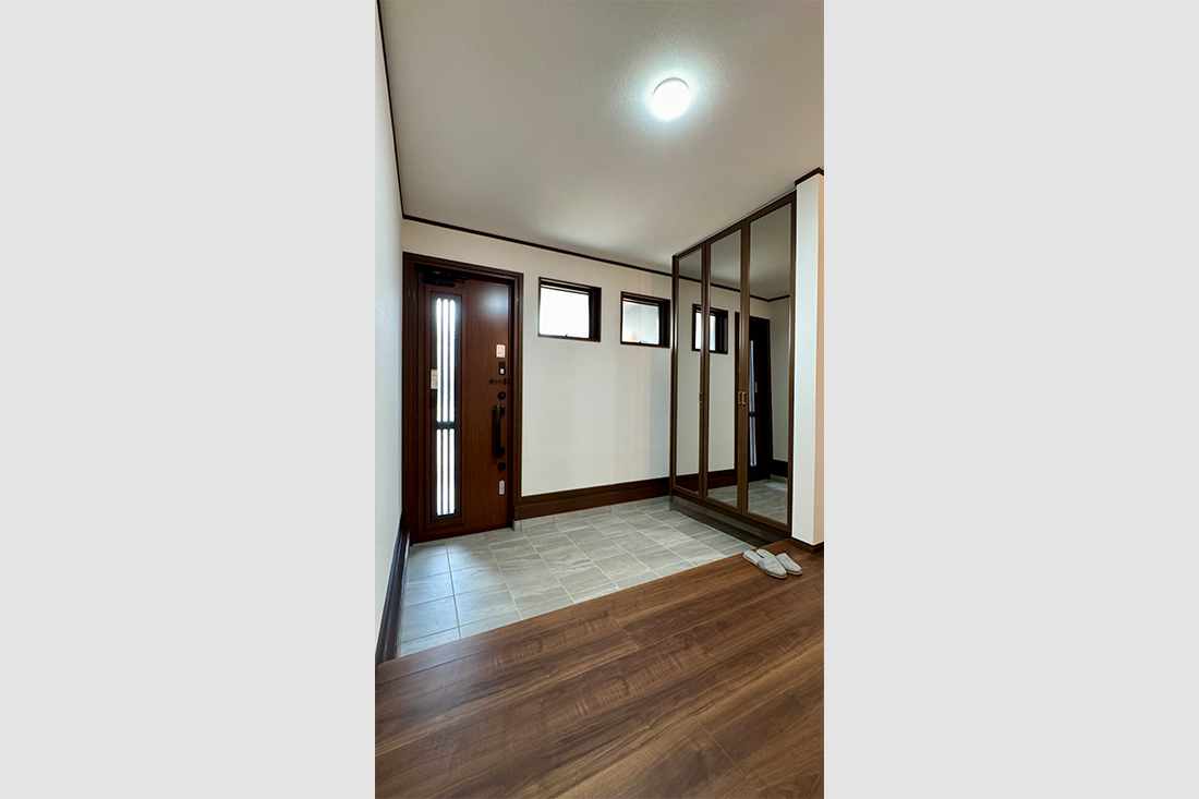 たっぷりの収納スペースを備え、全身鏡も付いた玄関。靴やコートはもちろん、季節用品も収められ来客時にはすっきりと。