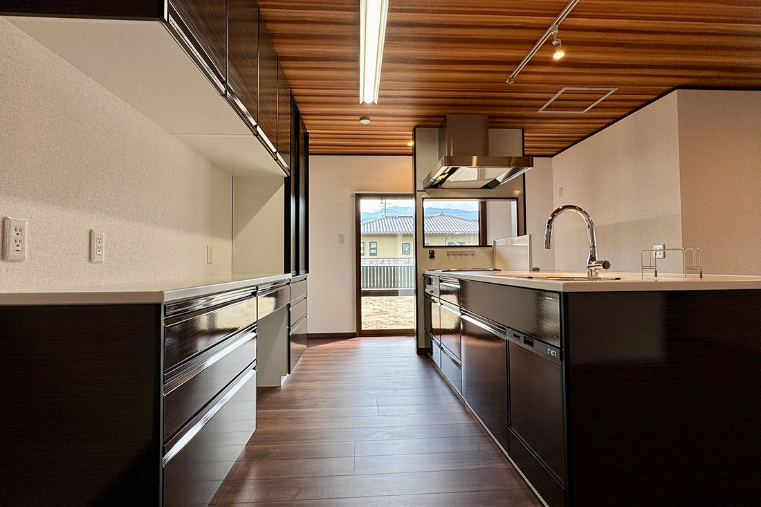 広いスペースだからこそ、その性能が活きる対面タイプのI型キッチン。家族や友人と会話を楽しみながら調理ができる。