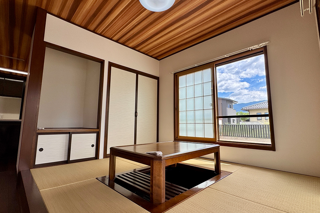 リビングダイニングと繋がる小上がりの和室。気軽に横になったり客間として利用したい。掘りごたつ付き。