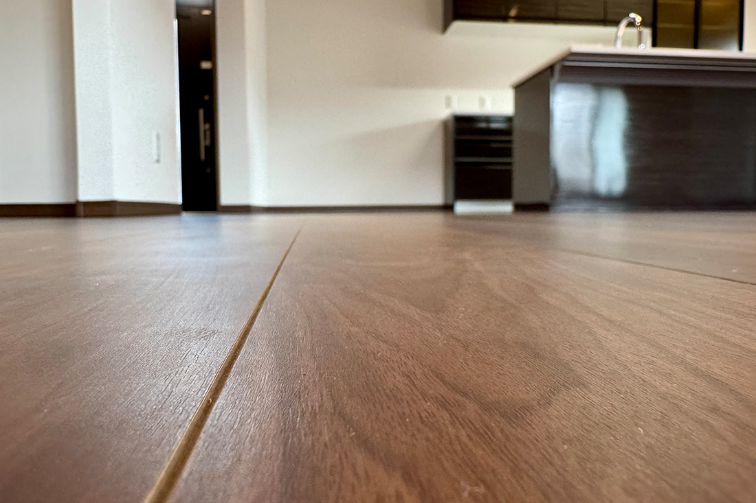 1階のフローリングには深みのあるダークブラウンを採用。木目がしっかりと浮き立つ質感が高級感と温かみを両立する。